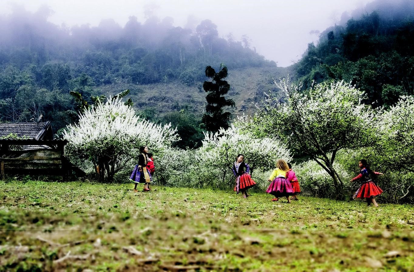 Bạn sẽ như lạc bước vào chốn thiên thai khi giữa sắc trắng của hoa mận, sắc hồng của hoa đào là những gam màu rực rỡ của những chiếc váy xòe, những tiếng leng keng của đồng bạc theo bước chân của những người thiếu nữ đi chơi xuân.